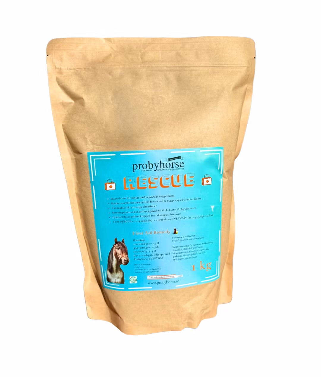 Aktivt kol används både traditionellt och inom modern medicin på grund av sin egenskap att binda skadliga substanser och patogena bakterier och föra ut dem ur kroppens system. Om hästens kropp är stressad av stor påfrestning, läkemedelsrester, omvälvande förändringar kan RESCUE vara som en första hjälp för att hjälpa hästen att göra sig av med det som stör en god tarmflora. Symptom som hästen kan visa är: Fri fekal vätska, diarre, tecken på dåligt upptag av näring, irritation, stor påverkan vid brunst, ovanligt känslig för yttre stress/påverkan. På bas av den kunskapen utvecklades Probyhorse RESCUE och förenar de positiva effekterna en kur med aktivt kol kan ge tillsammans med välkända örter som traditionellt använts för att stötta mage/tarm, lever och njurar. Örterna är från kontrollerade ekologiska odlingar av hög kvalitet. Alla ingredienser i RESCUE är naturliga, fria från GMO och fermenterade tillsammans.